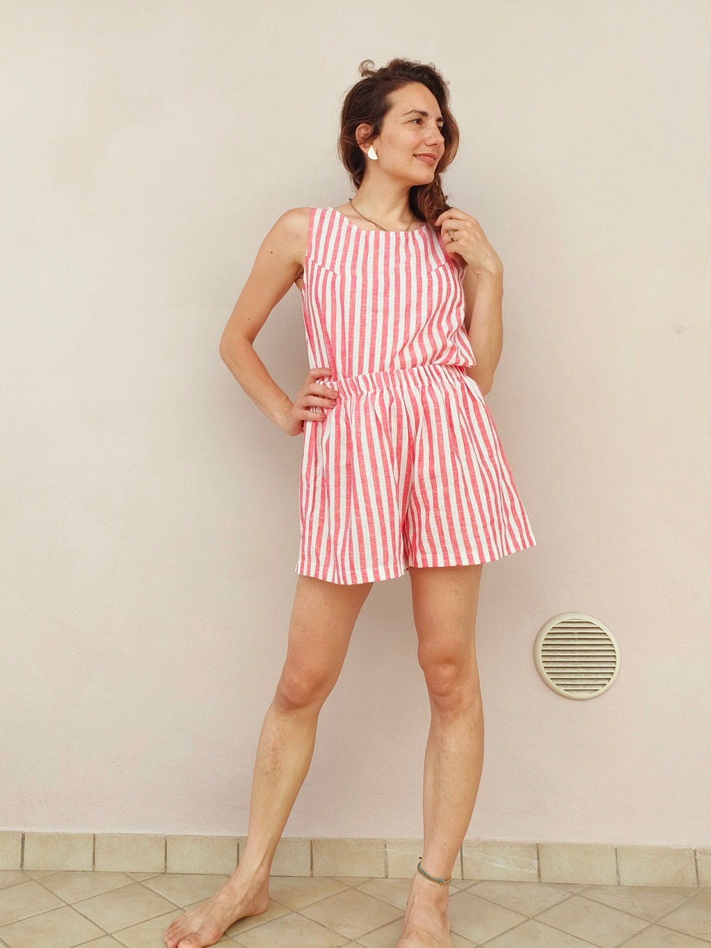 Completo in lino gessato: canotta e pantaloncino coordinati, leggeri e freschi come una brezza estiva. Linea pulita, taglio minimal, dettagli vintage rivisitati: scollo barchetta, elastico comodo e una piccola tasca discreta. Realizzato in lino naturale e sostenibile, è perfetto per sentirti a tuo agio in città, al mare o dove vuoi tu. Indossalo insieme per un look raffinato ma rilassato, oppure spezza i pezzi per creare ogni giorno nuove combinazioni.