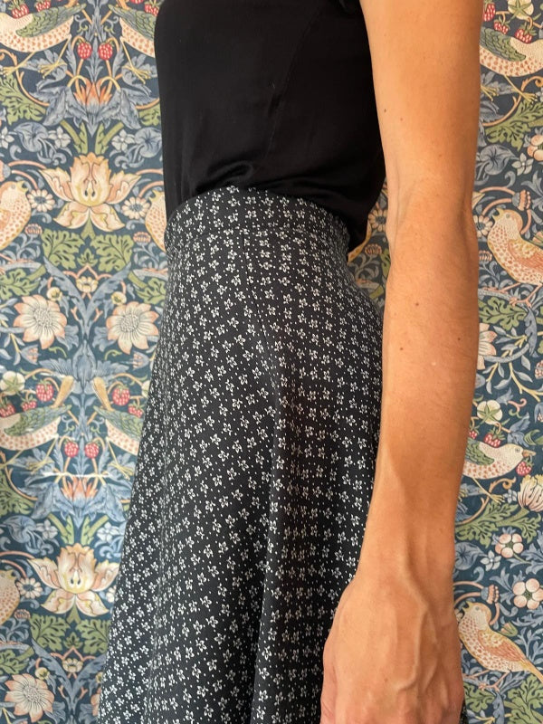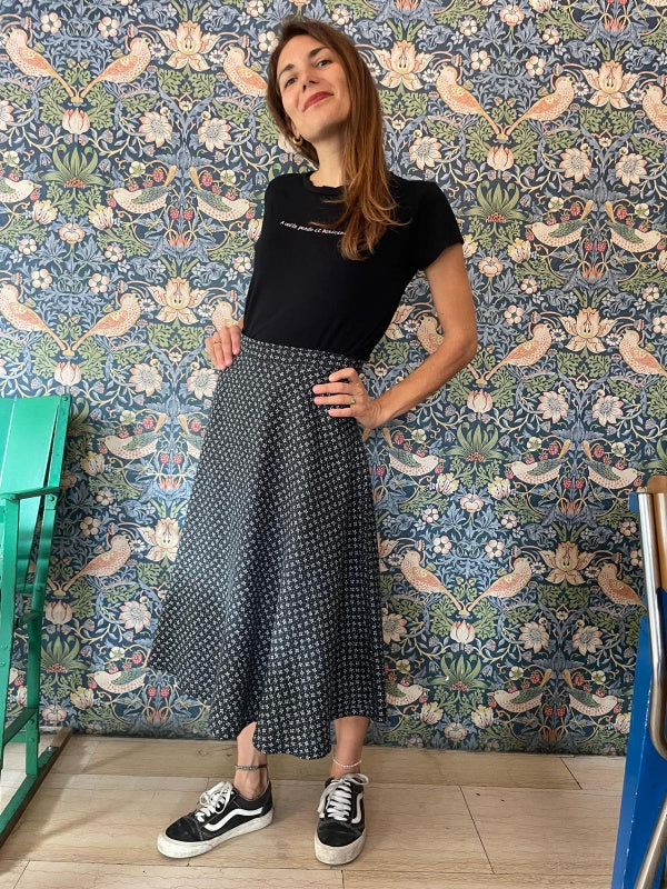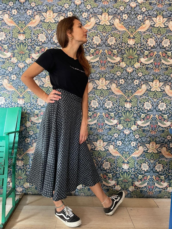 La gonna a ruota in viscosa nella fantasia etnica è l’emblema della femminilità e della primavera.